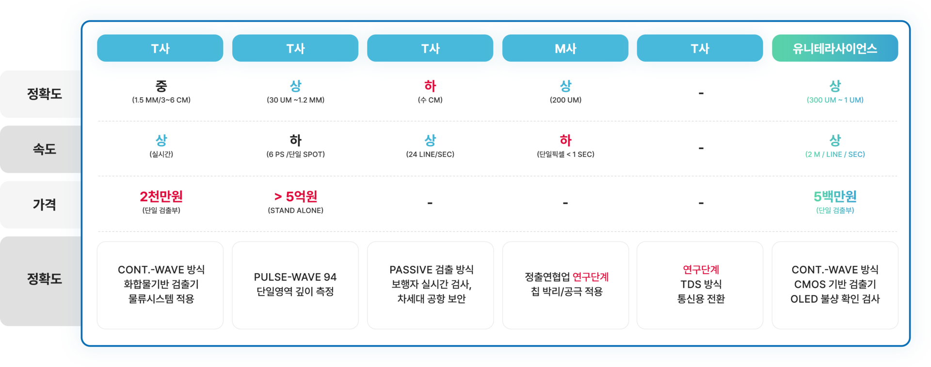 유니테라는 고객사가 원하는 3대 조건(High Accuracy, High Speed, Low Cost)을