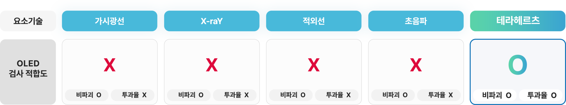 THz는 기존 가시광·X-ray·초음파가 풀지 못한 OLED 공정의 본질적 문제를 해결하는 유일한 솔루션입니다.