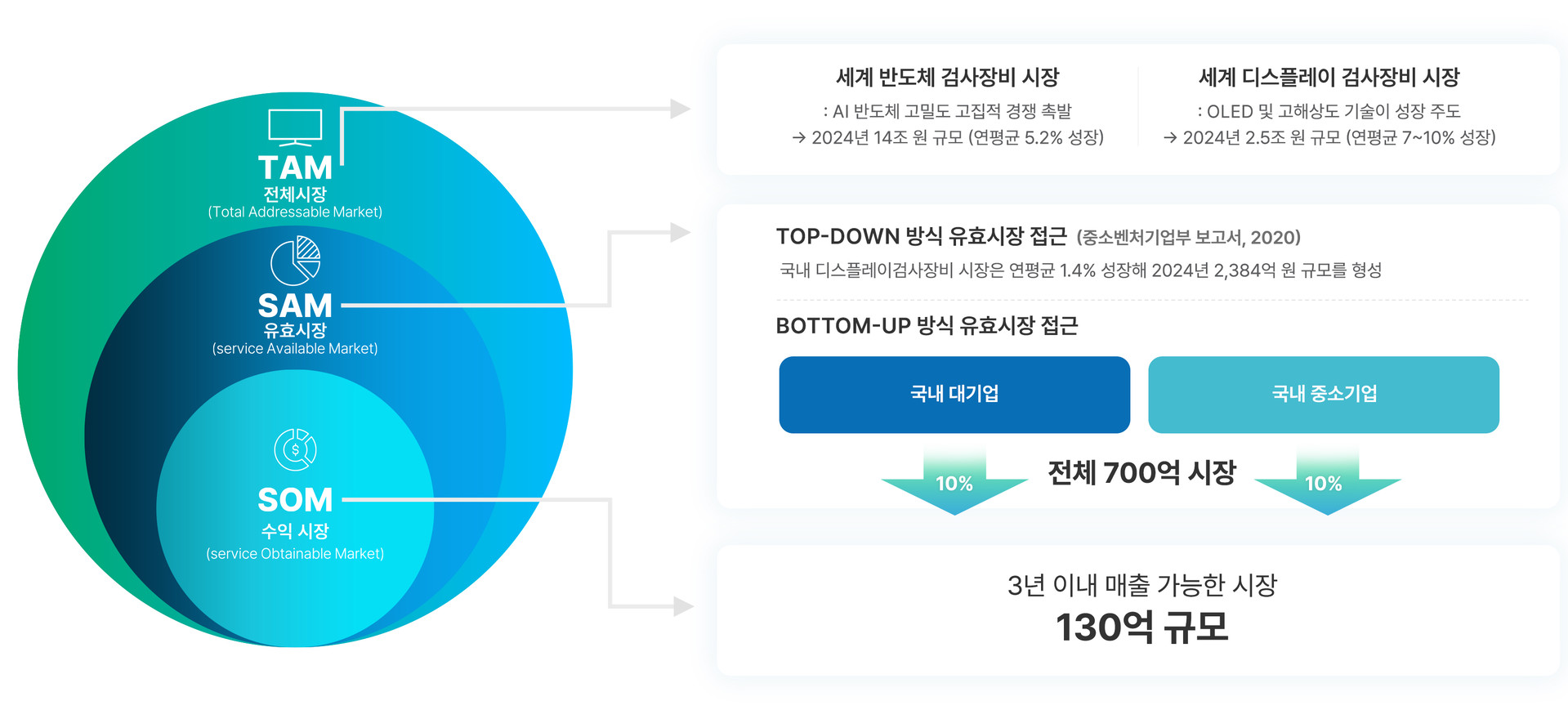 THz 기반 OLED 공정검사 시장은 이미 형성된 대형 수요(TAM)를 기반으로, 대기업·중소기업 모두 즉시 진입 가능한 실 매출 시장(SOM)까지 직결되는 구조입니다.