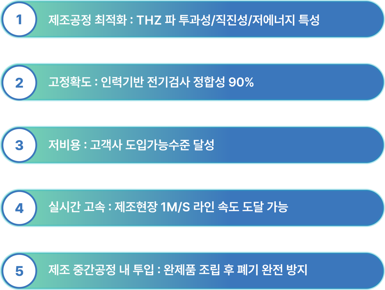 THz 기반 실시간·대면적 검사는 제조공정 최적화, 높은 정합도, 저비용 도입, 고속 라인 대응 등 수율 향상에 필요한 핵심 조건을 충족합니다.